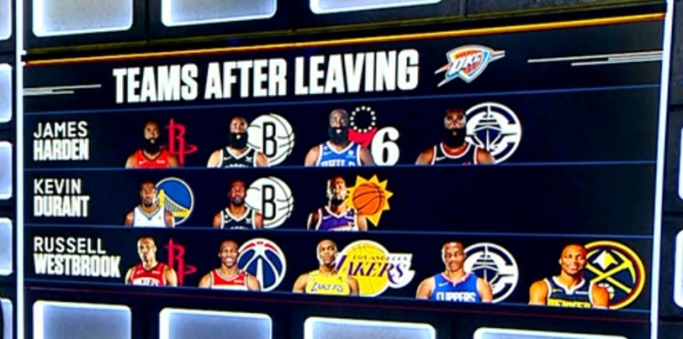 雷霆老三少离队后换队数量:威少5次最多 哈登4次 杜兰特3次